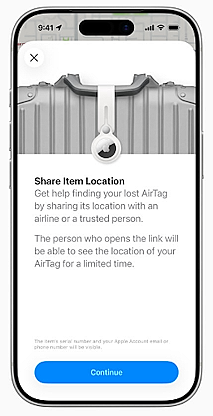 Grâce à « Partager la localisation d’un objet », les utilisateurs peuvent partager la position d’un objet égaré avec le service client d’une compagnie aérienne participante. Selon SITA, un fournisseur informatique de premier plan pour le secteur aérien, les compagnies indiquent que l’utilisation de « Partager la localisation d’un objet » a permis de réduire les retards de bagages de 26 % et de diminuer de 90 % les cas de bagages « véritablement perdus » ou irrécupérables. L’accès est accordé uniquement au personnel autorisé via une authentification sécurisée par compte Apple ou par un partenaire. La localisation partagée est désactivée dès que l’utilisateur récupère son objet, peut être interrompue à tout moment par le propriétaire et expire automatiquement après sept jours.
