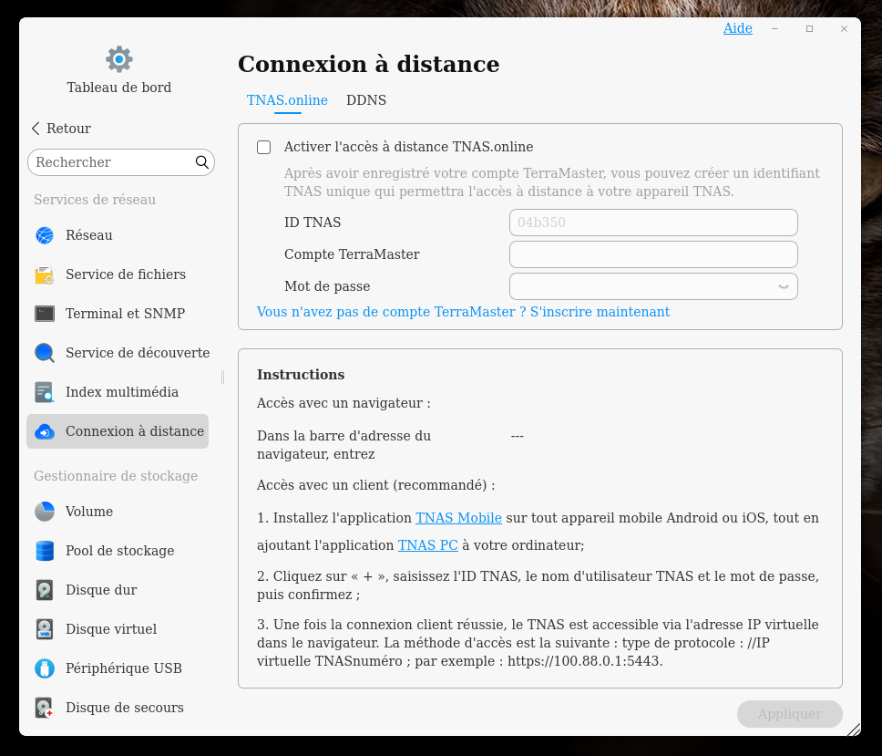 - utiliser l’application TNAS PC. Celle-ci est disponible sous Windows, Mac OS (pkg, pour Apple ARM et Intel x86) et Linux (paquet .deb), en version 5.2.325. Toutefois, le guide de mise en route n’indique pas l’existence de la version Linux, que l’on pourra toutefois trouver dans la page des téléchargements ;