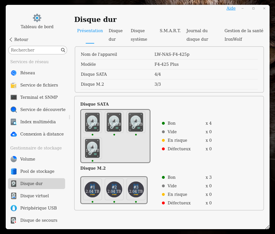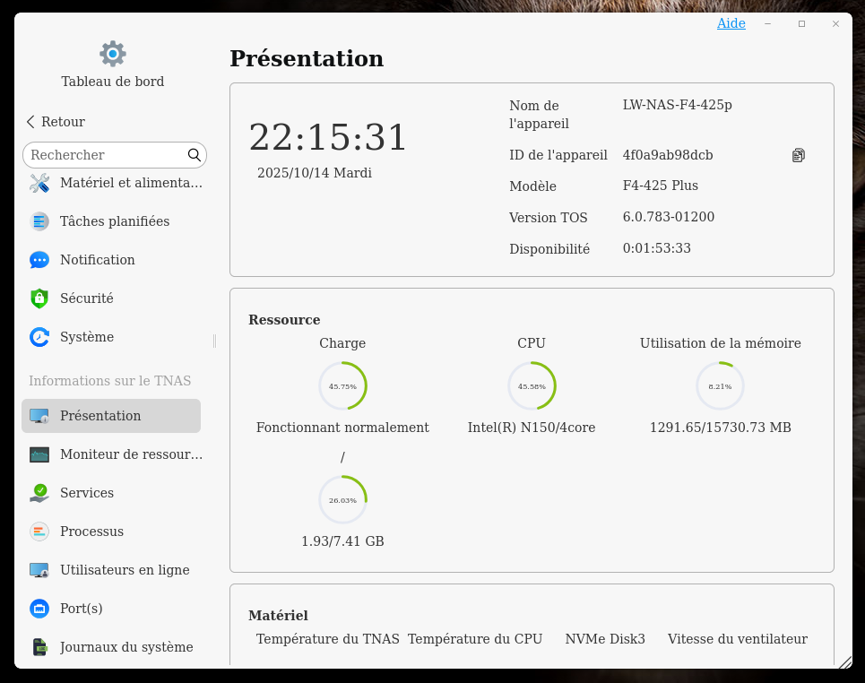 Les NAS de la marque TerraMaster embarquent un système propriétaire appelé TerraMaster OS (TOS). Le F4-425 Plus offre les fonctionnalités suivantes :