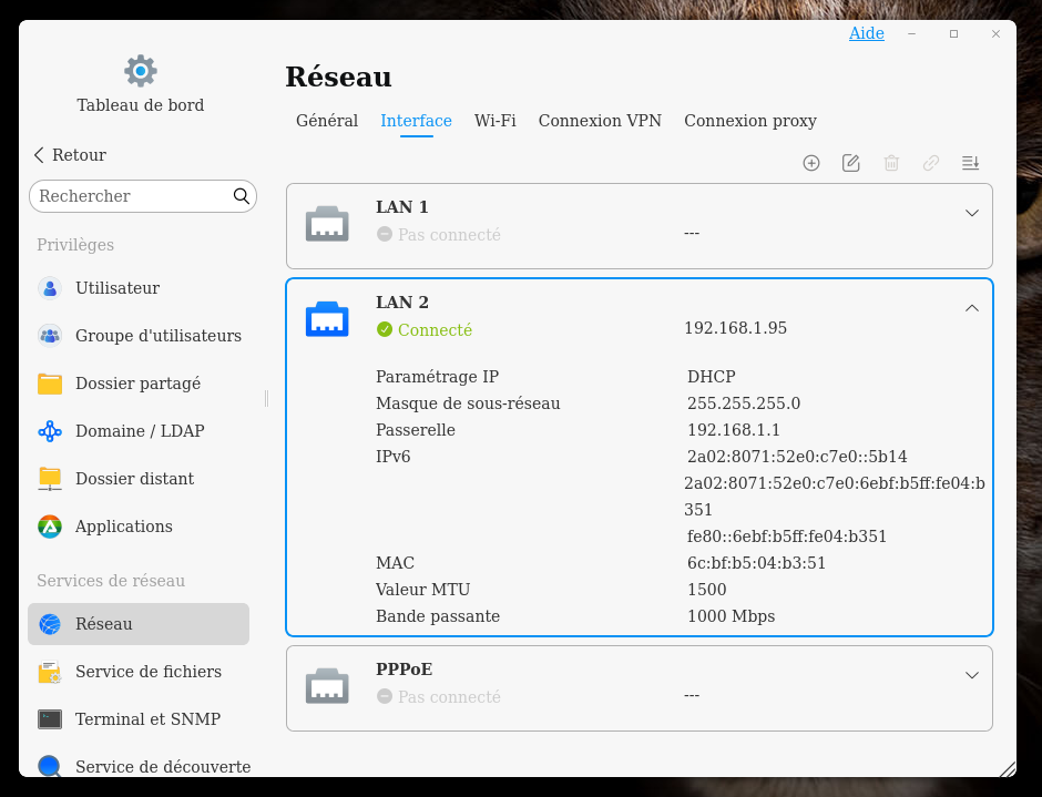 Toutefois, l’agrégation de liens peut être utile si deux machines se connectent au NAS et initie un transfert. Le débit en sortie du NAS pourra atteindre les 10 Gbps sans même activer les options sus-mentionnées.